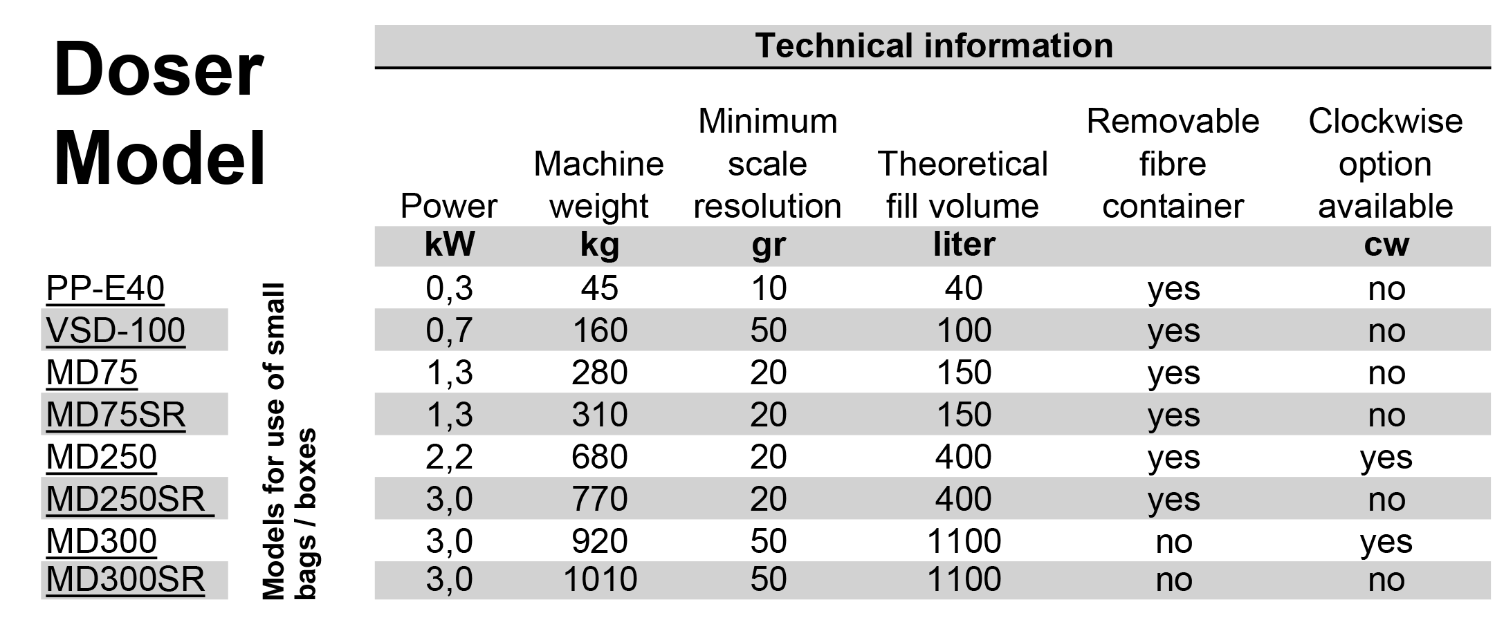 Models for Small bags/boxes Dosing.